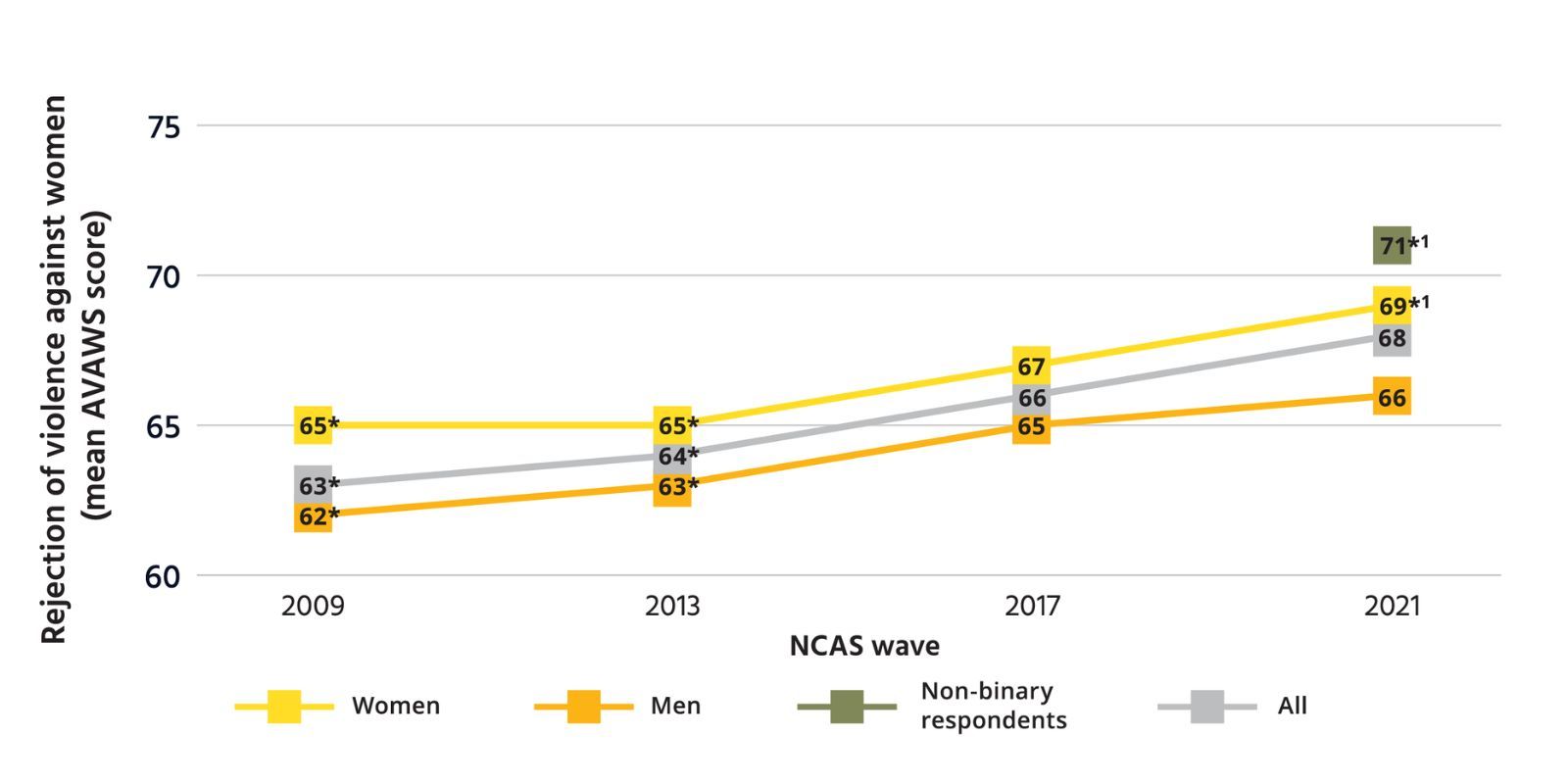However, there was no significant improvement in overall attitudes towards violence against women between 2017 and 2021, largely reflecting a plateauing of attitudinal rejection of domestic violence despite an improvement in attitudinal rejection of sexual violence since 2017.