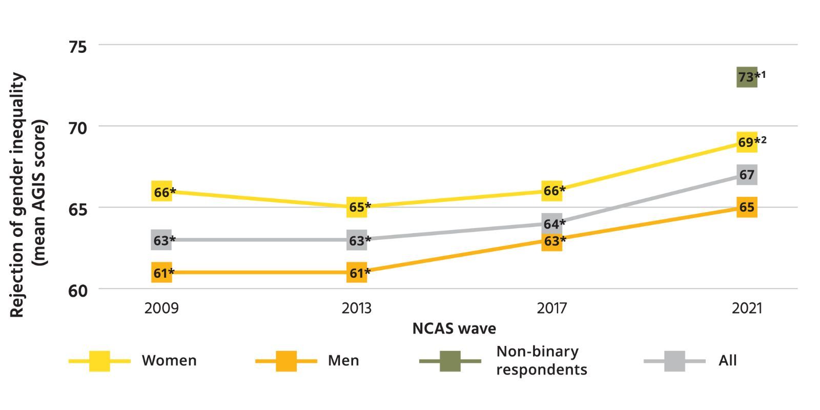 The Attitudes towards Gender Inequality Scale (AGIS) tells us how strongly Australians reject gender inequality in its different forms. The higher the score, the stronger the rejection of gender inequality in different contexts. For example, one item in the AGIS asks whether respondents agree or disagree that men generally make more capable bosses than women.